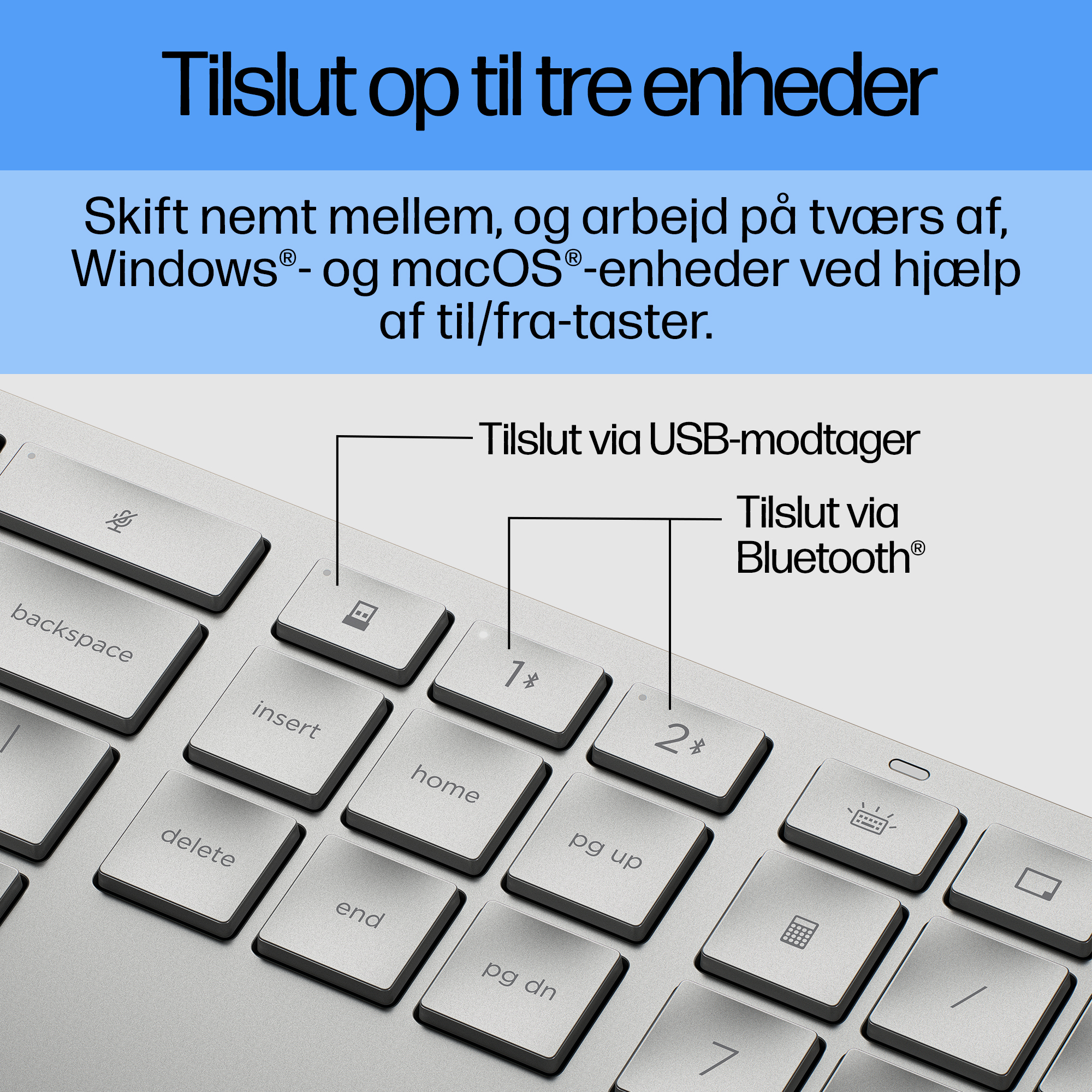 Flere tilslutningsmuligheder giver mere fleksibilitet. Tilslut op til 3 enheder ─ 2 via Bluetooth® og 1 via 2,4 GHz USB-A-dongle, og skift mellem enhederne ved hjælp af én knap. Du kan også nemt parre ekstraudstyr til en Windows 10-pc med to trin ved hjælp af Microsoft Swift Pair.