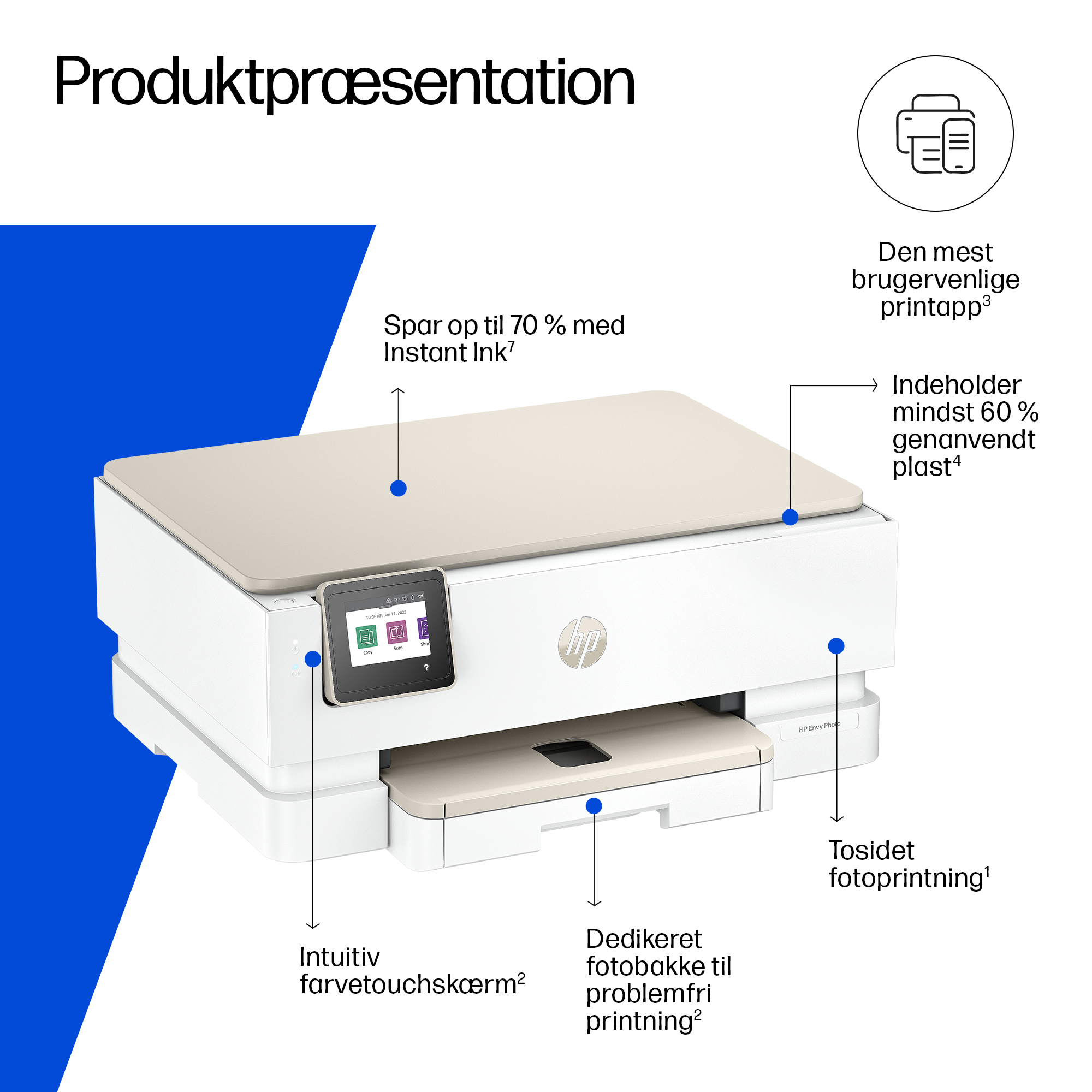 | Kassens indhold | HP Envy Photo 7230 All-in-One-printer; Original HP 303-startblækpatron, sort; Original HP-startblækpatron, trefarvet; Opsætningsvejledning; Referencevejledning; Strømledning |