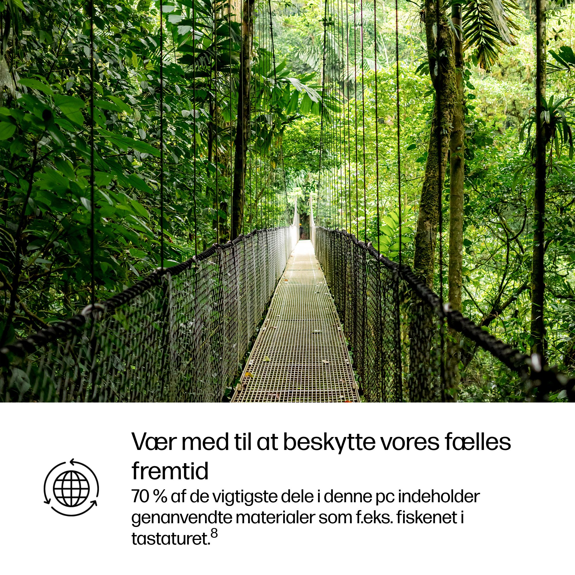 | Bæredygtige teknologier og materialer | Lavt halogenindhold; Bulk-emballage tilgængelig; 35 % PCR-plast; 30 % ocean-bound plast; 90 % genanvendt metal; 50 % ocean-bound plast i blæserkabinettet; 100 % af HP's papirbaserede emballage er fra genanvendte eller certificeret bæredygtige kilder. |
