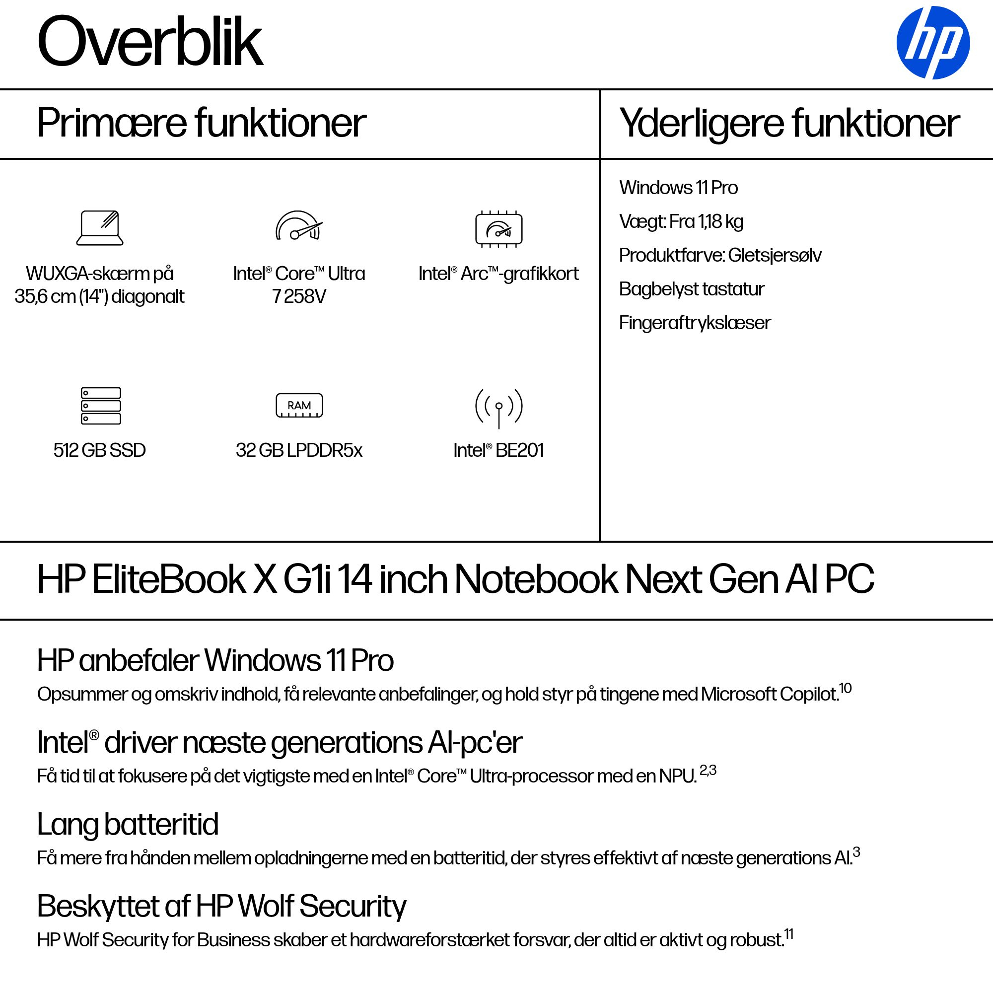 HP EliteBook X EBXG1i14AI U7 258V 14 32GB/512 PC NX Copilot+ PC Intel Core Ultra 7 Laptop 35,6 cm (14") WUXGA LPDDR5x-SDRAM 512 GB SSD Wi-Fi 7 (802.11be) Windows 11 Pro Sølv
