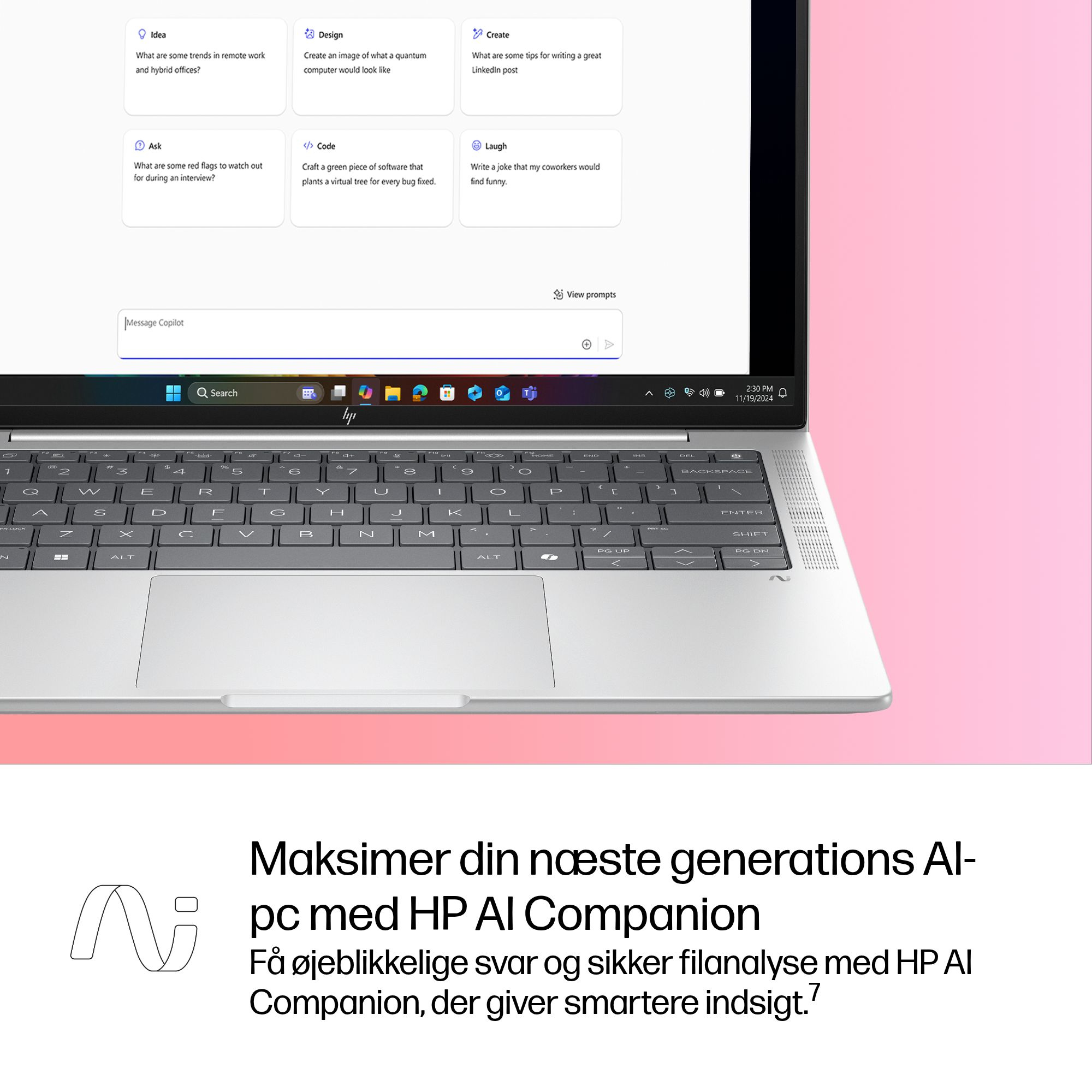 Arbejd hvor som helst uden at gå på kompromis med ydeevne med Windows 11 og HP's teknologi til samarbejde, sikkerhed og tilslutning. Opsummer og omskriv indhold, få relevante indholdsanbefalinger, og hold styr på tingene med Microsoft Copilot.[6]
