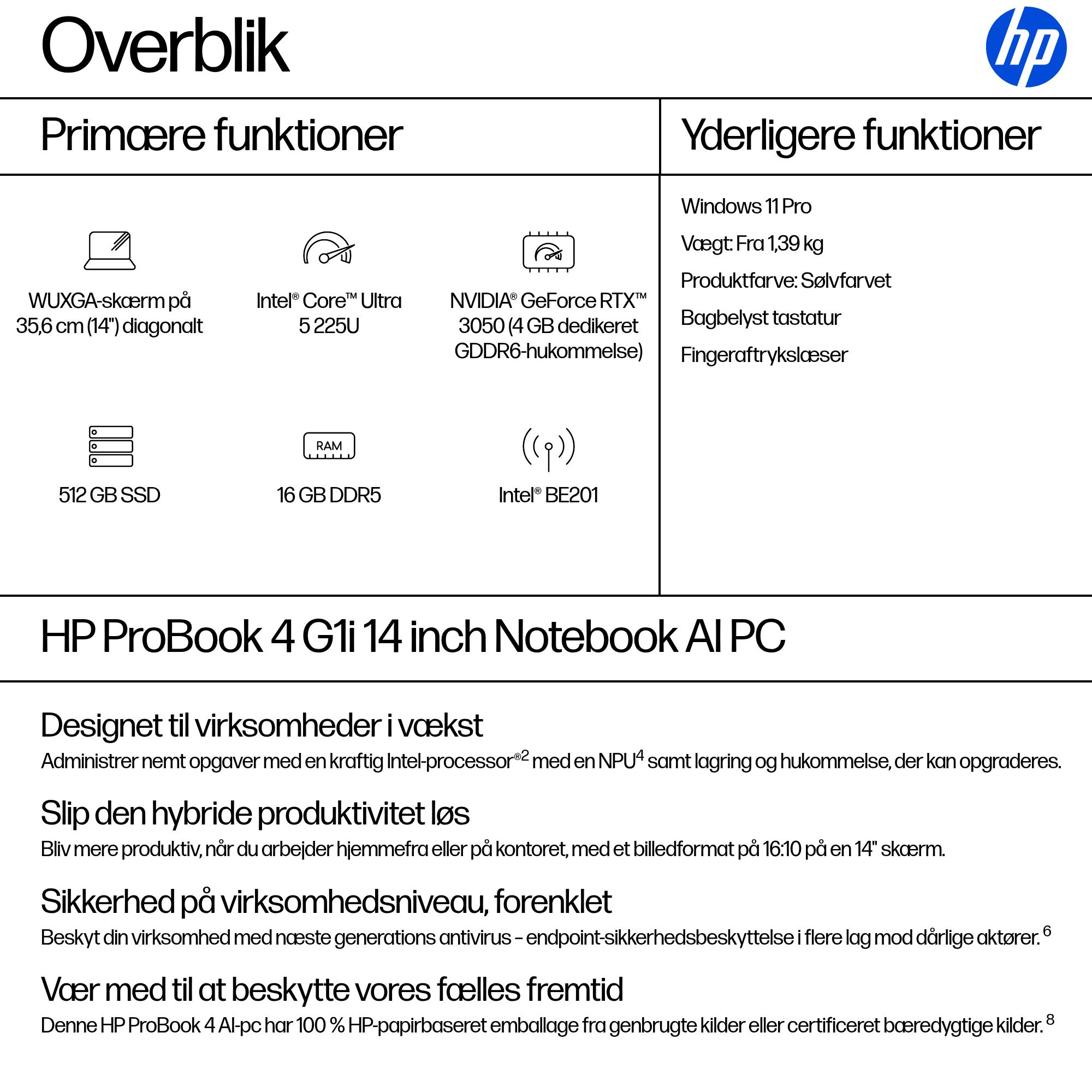 | Supporttjeneste inkluderet | HP CO2-neutral computerservice ─ til døren med brugsservice til notebooks. Læs mere om vilkår og betingelser på https://h20195.www2.hp.com/v2/GetPDF.aspx/4AA8-1894DAE & https://www8.hp.com/h20195/v2/getpdf.aspx/4AA5-7123DAE.pdf |